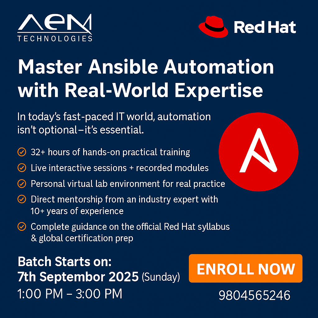AEM Technologies, Kolkata is the #1 RedHat, Cloud, DevOps, Amazon Web Services (AWS), Azure, Ansible, Jenkins, RedHat Openstack, Docker training institute in Kolkata. AEM Kolkata is an ISO 9001:2015 certified organization. We are the best RedHat Certified Training Partner. Education environment made AEM the most preferred institute in Kolkata for RedHat, AWS, Microsoft Azure and DevOps Training Courses. AEM is situated in prime location in the heart of the city, Kolkata. AEM is continuously serving students and working executives for skill-based training in the field of IT with Global Certifications like RHCE, RHCVA, RHCA, OpenStack, AWS Certified Solutions Architect, AWS SysOps, Microsoft Azure, Docker, RedHat OpenShift, RedHat Ansible, Git, Clustering and Storage, CCNA (R & S) and MCSA.